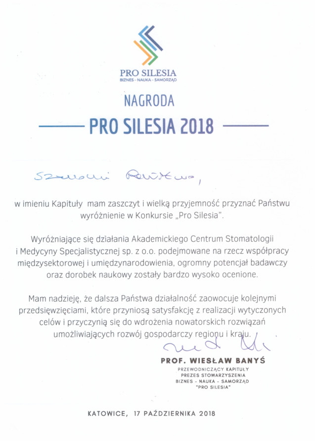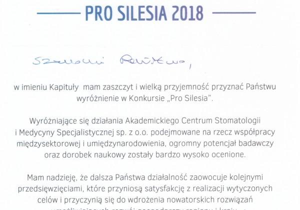 Miło nam poinformować, iż ACSiMS Sp. z o.o. otrzymało wyróżnienie w Konkursie "Pro Silesia". Kapituła doceniła nasz wkład na rzecz współpracy międzynarodowej, potencjał badawczy oraz dorobek naukowy.